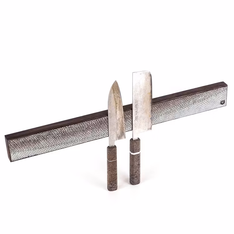 Salmon Leather Knife Holder This knife holder is made of massive swedish black-stained oak with strong neodym magnets covered with vegetable tanned natural salmon leather from Island.Salmon leather is very strong, luxury and ecofriendly!Available in 500-615 x 60 x 24 mm 1 895 kr Sold out